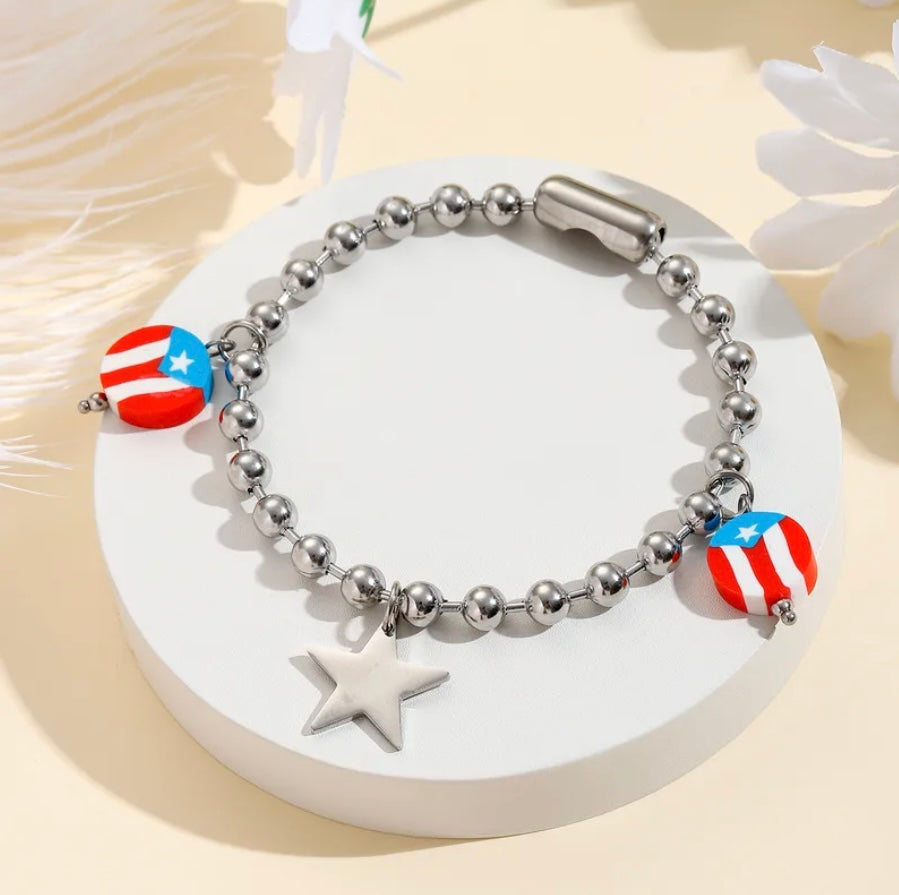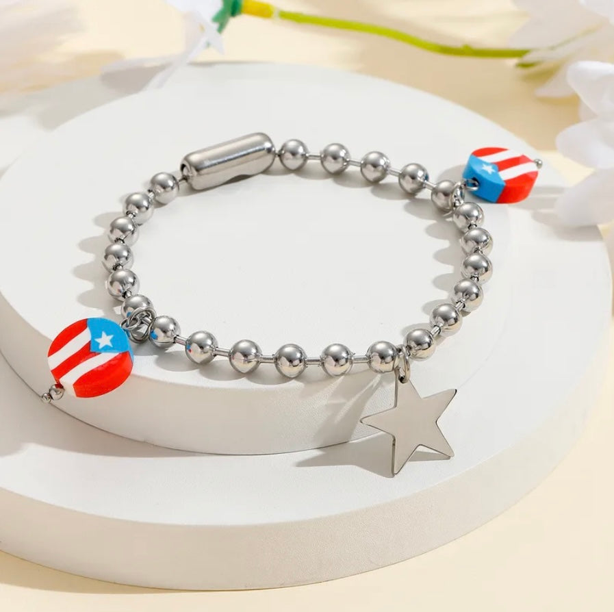 La Pulsera Alborada es un tributo al orgullo boricua y a la belleza de un nuevo amanecer. Confeccionada en acero inoxidable 304 de alta calidad, resiste al agua y al deslustre, asegurando brillo y durabilidad. Su diseño con cuentas metálicas se realza con dijes de la bandera de Puerto Rico y una estrella, símbolos de fuerza, esperanza y amor por la isla. 🇵🇷⭐