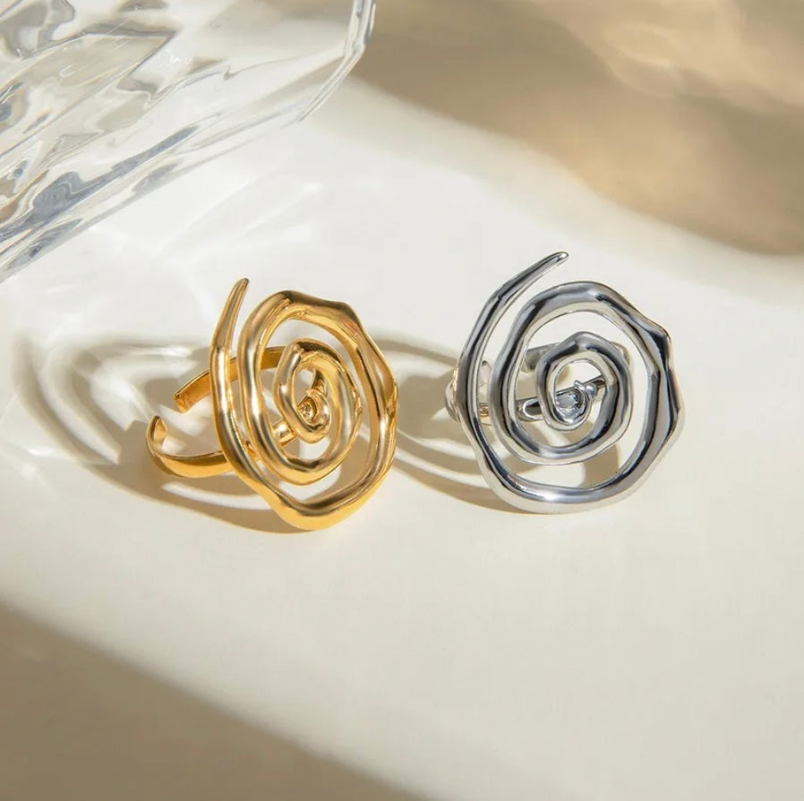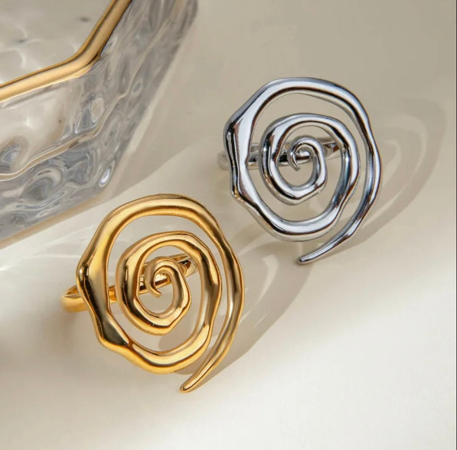 El Anillo Ariadna combina arte y sofisticación en un diseño espiralado único que simboliza movimiento y elegancia. Elaborado en acero inoxidable 304 con recubrimiento en oro PVD de 18 quilates, es resistente al agua y al deslustre, garantizando brillo y durabilidad.