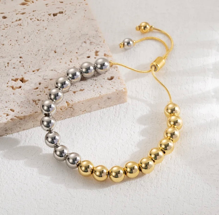 La Pulsera Bianca es la combinación perfecta de elegancia y versatilidad. Su diseño bicolor, con cuentas en tonos dorado y plateado, la convierte en una pieza moderna y sofisticada que se adapta a cualquier ocasión. Elaborada en acero inoxidable de alta calidad con recubrimiento en oro PVD de 18 quilates, es resistente al agua y al deslustre, garantizando brillo y durabilidad.