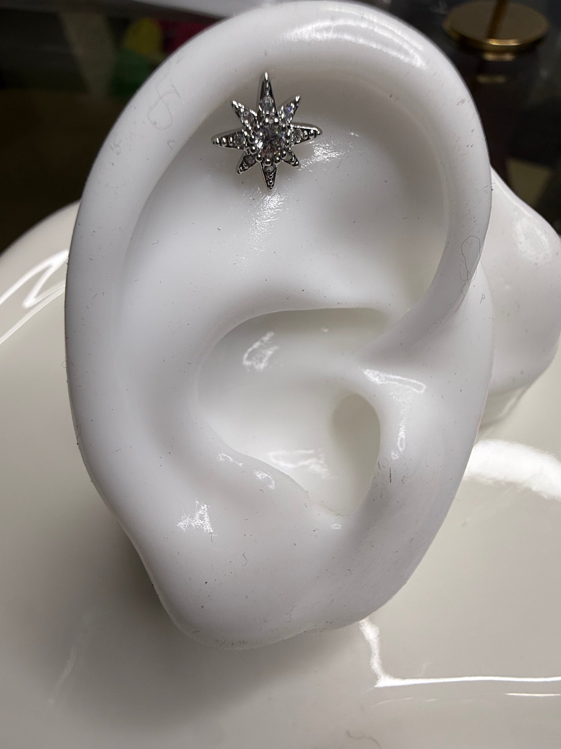 El Piercing Celina está inspirado en la magia de las estrellas. Con un diseño en forma de estrella de ocho puntas adornada con circonias brillantes, esta pieza aporta un toque celestial y sofisticado a tu estilo. Elaborado en acero inoxidable 316L, es hipoalergénico, resistente al agua y al deslustre.