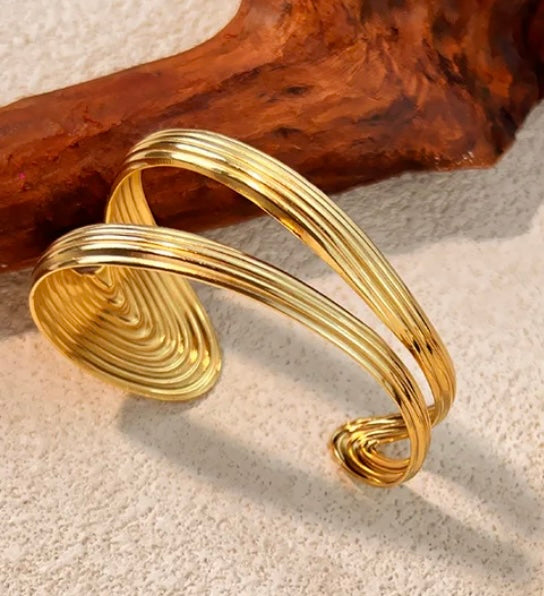 La Pulsera Dione es un accesorio sofisticado con un diseño geométrico de líneas en dorado que transmite fuerza y elegancia. Fabricada en acero inoxidable con recubrimiento de oro, es resistente al agua y al deslustre, ideal para el uso diario sin perder su brillo.