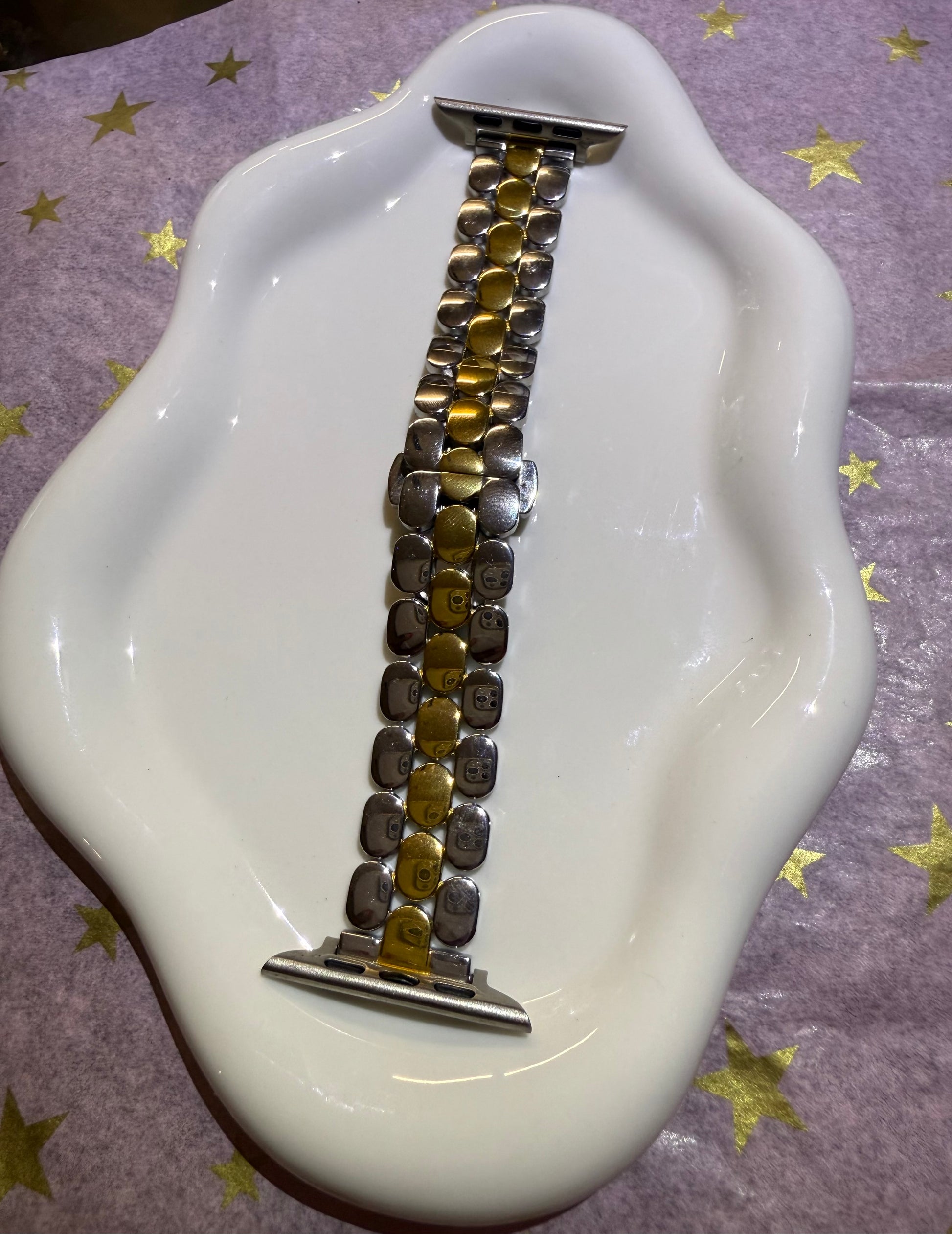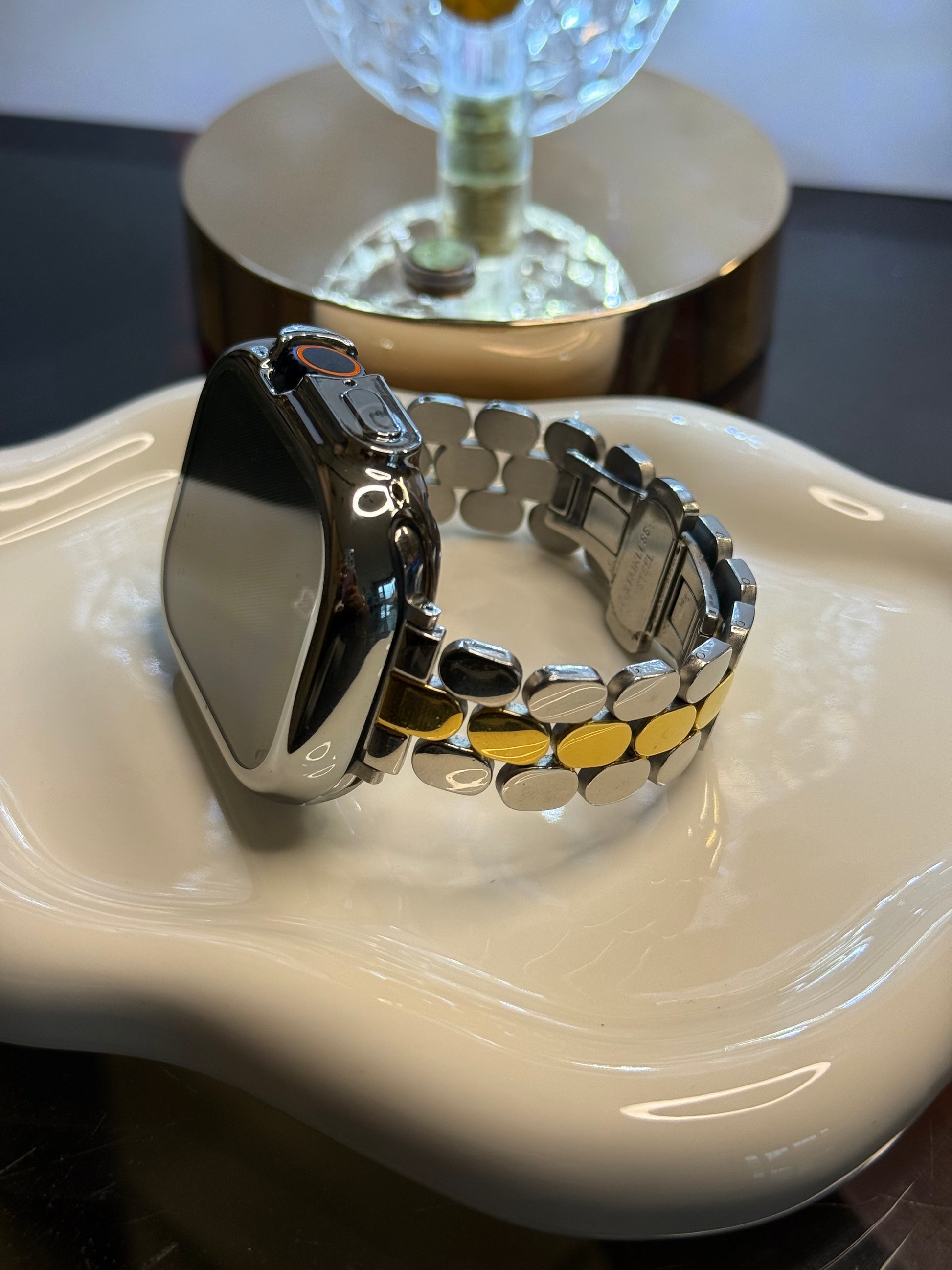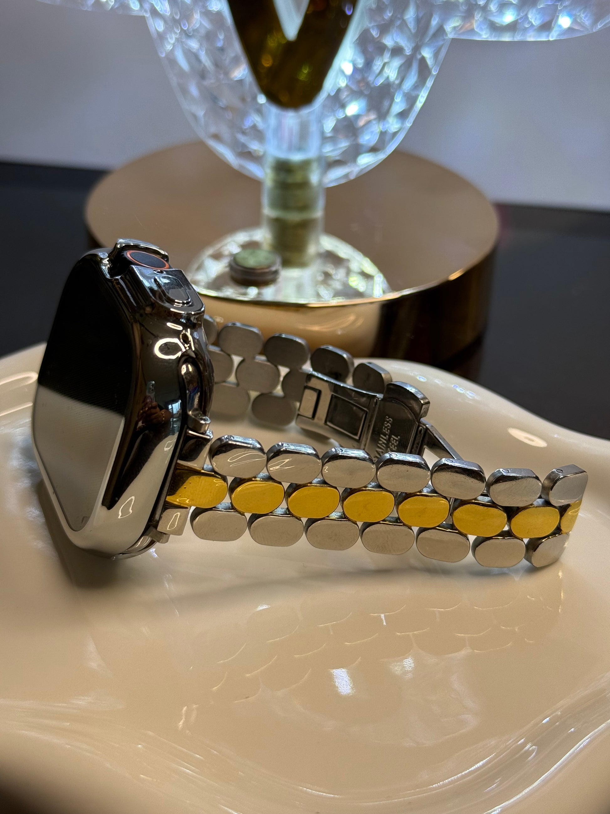 Resalta tu estilo con Dual Elegance, una correa bicolor de acero inoxidable en plata y dorado que aporta sofisticación y versatilidad a tu Apple Watch. Su diseño moderno combina resistencia y lujo, convirtiéndola en el accesorio ideal para cualquier ocasión.
