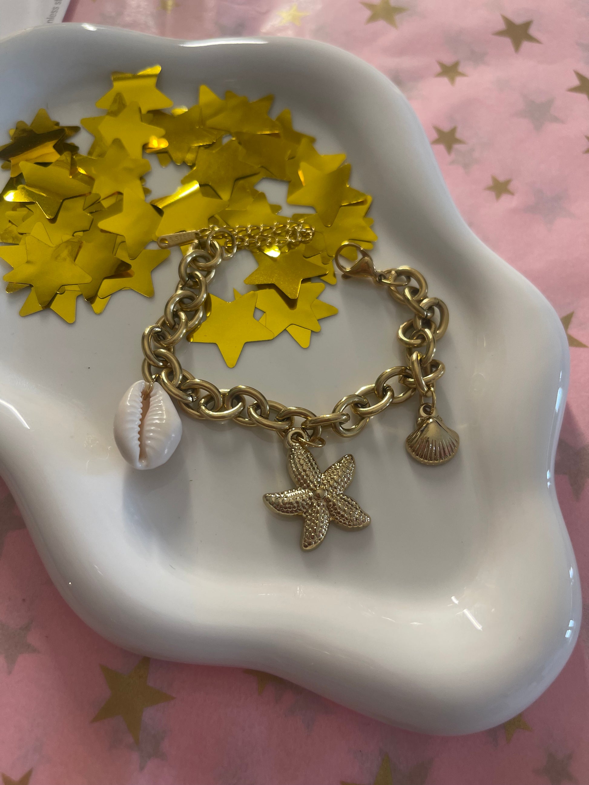 Esta pulsera estilo cadena con charms de estrella de mar, conchita y caracol evoca la frescura tropical y la libertad de las olas. Fabricada en acero inoxidable 304 chapado en oro de 18K, es resistente al agua y perfecta para el verano… o para llevar un pedacito de playa contigo todo el año.