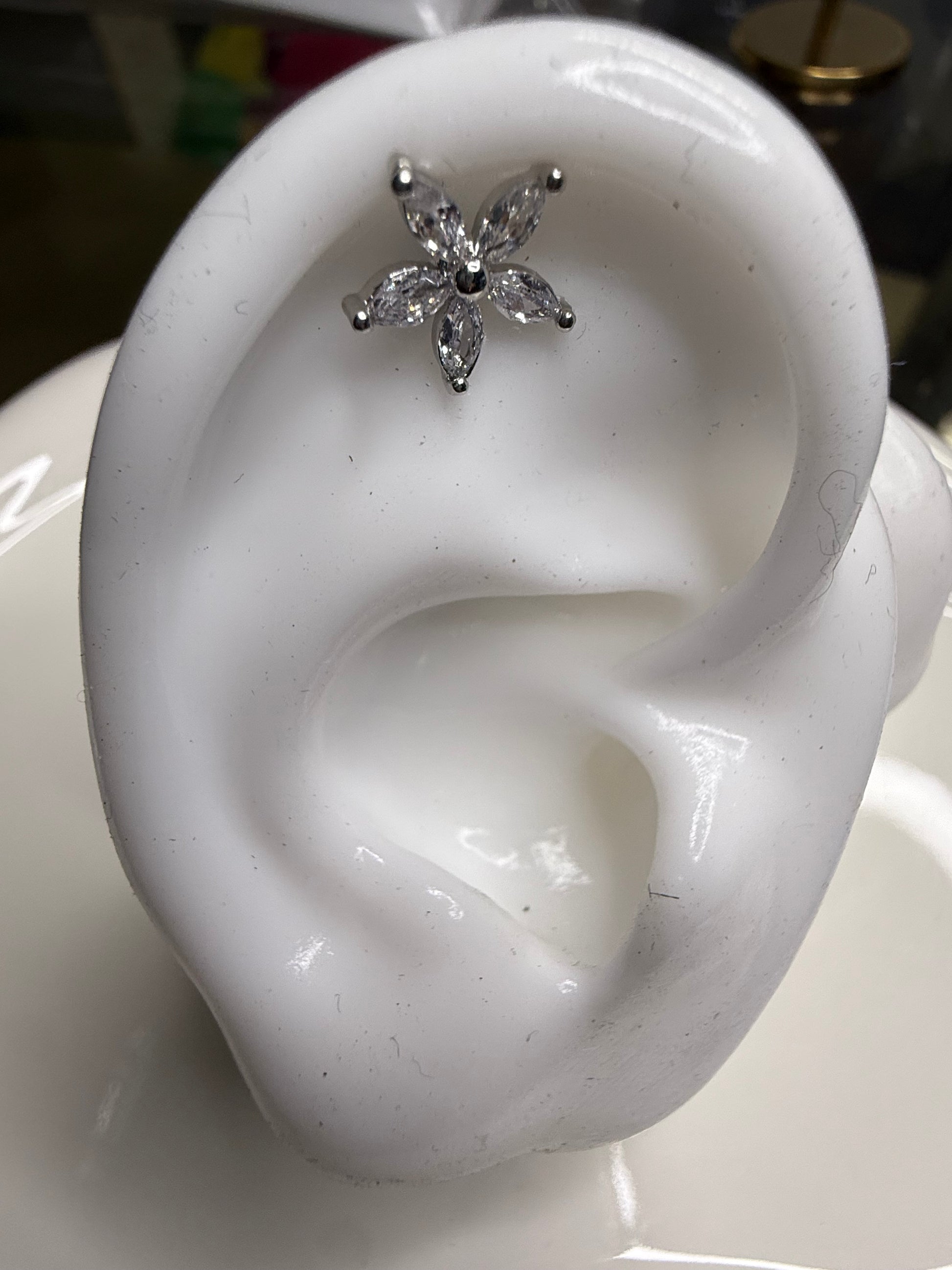 El Piercing Flavia es una joya delicada y femenina que resalta por su diseño en forma de flor con pétalos de circonias brillantes. Elaborado en acero inoxidable 316L, es resistente al agua y al deslustre, ideal para lucir un estilo elegante y duradero.