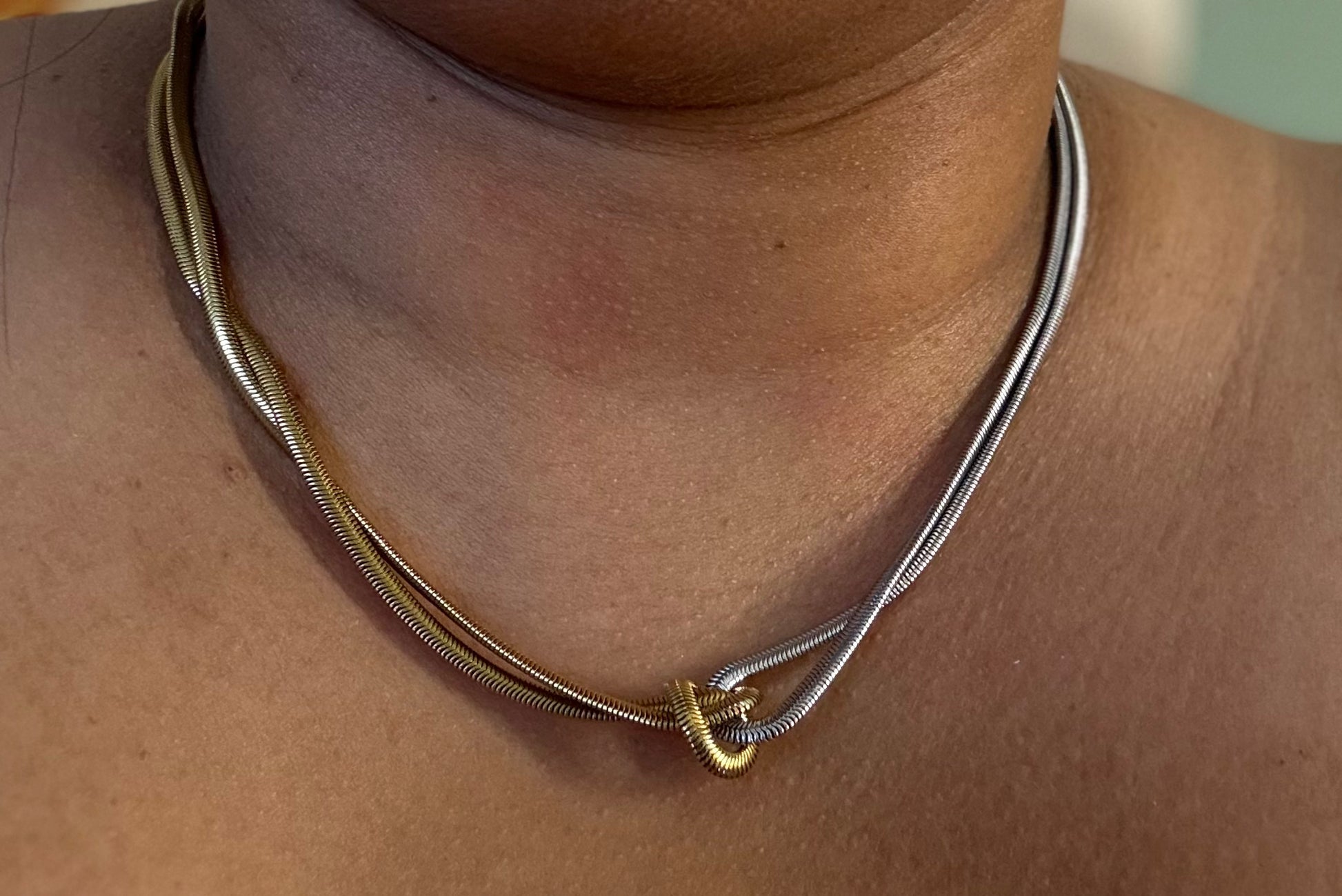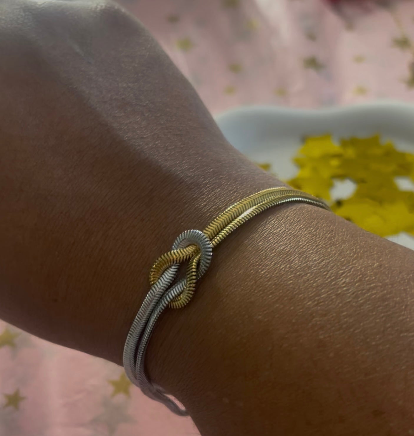 Este set de collar y pulsera en acero bicolor (dorado y plateado) presenta un delicado nudo que simboliza la unión, la fuerza y la conexión eterna. Su acabado brillante y moderno lo hace perfecto para ocasiones especiales o para elevar cualquier look diario con un toque de sofisticación.