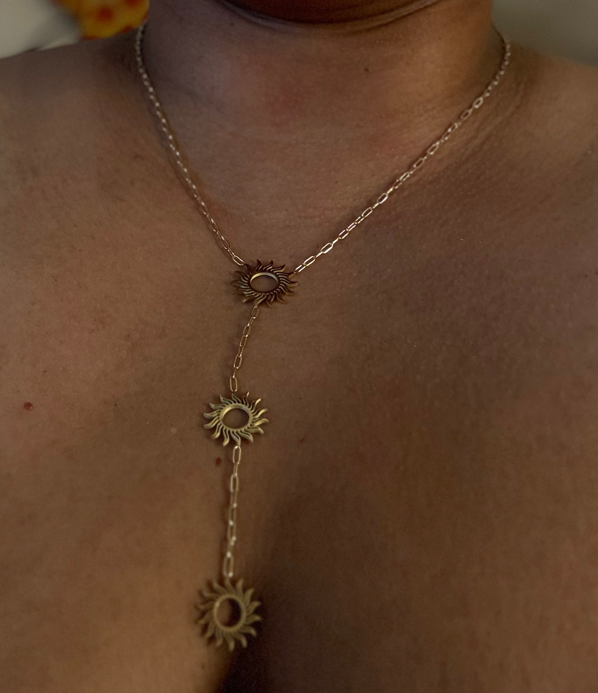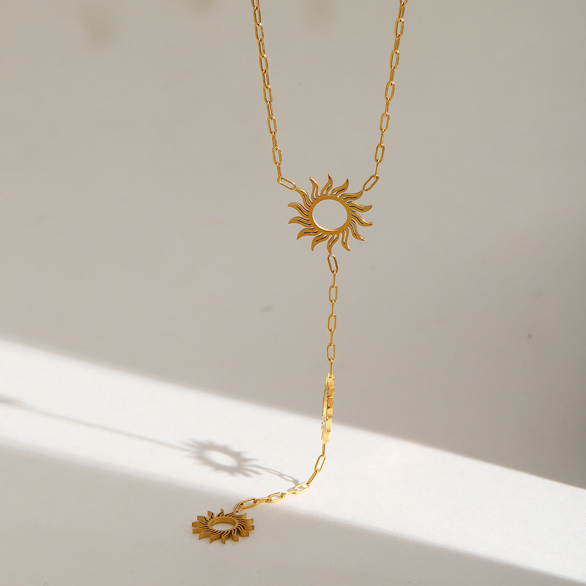 Este elegante collar tipo y-drop presenta un diseño solar moderno, elaborado en acero inoxidable 304 chapado en oro de 18K, resistente al desgaste y con un acabado radiante.